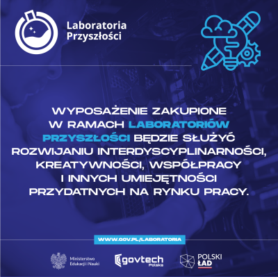 Laboratoria Przyszłości to nowoczesny sprzęt, który uatrakcyjni zajęcia szkolne i pozwolą uczniom rozwijać swoje zainteresowania nie tylko na lekcjach techniki i w?ramach innych obowiązkowych zajęć edukacyjnych, lecz także w ramach zajęć pozalekcyjnych, kół zainteresowań i innych form rozwijania umiejętności.