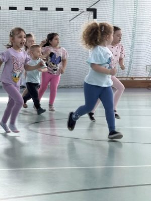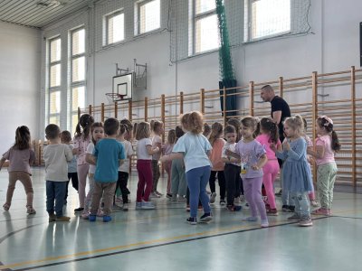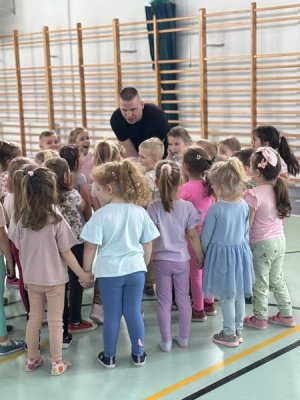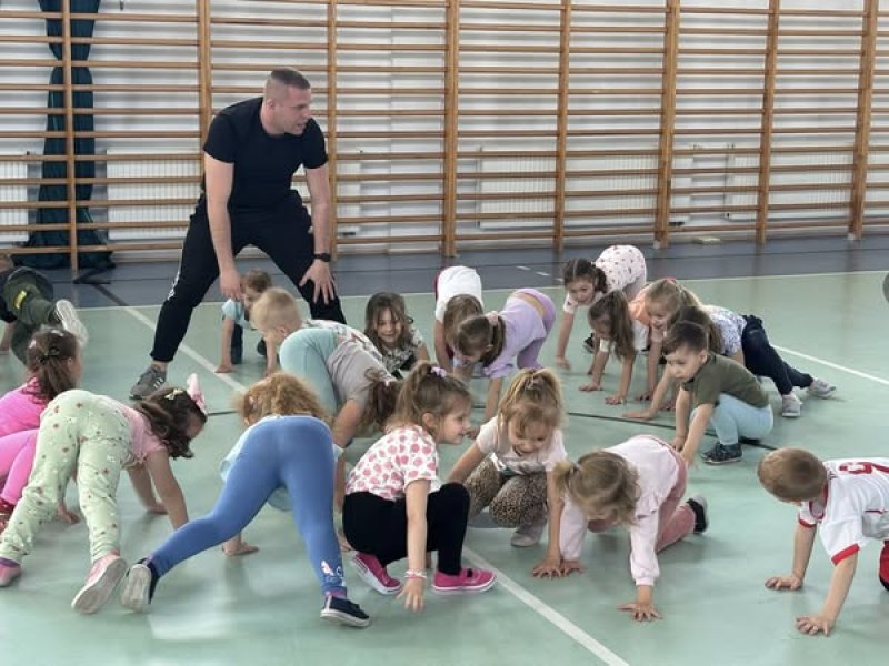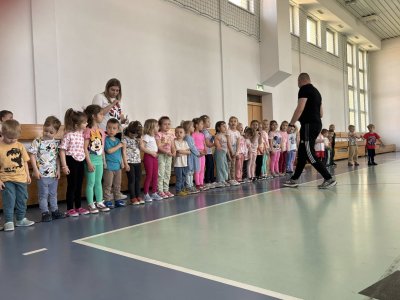 od rozgrzewki z Panem Jankiem, po której przedszkolaki złożyły sportową przysięgę. Następnie