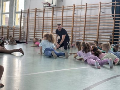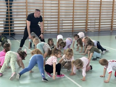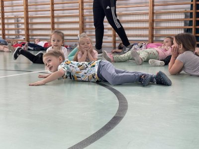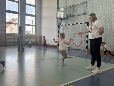 Na sali gimnastycznej w szkole na dzieci czekało mnóstwo sportowych atrakcji. Zabawa zaczęła się