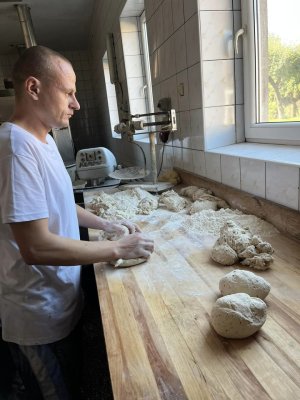 Pan Piotr Janik piekarz pokazał proces powstawania chleba na większą skalę.