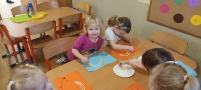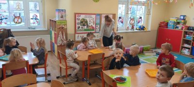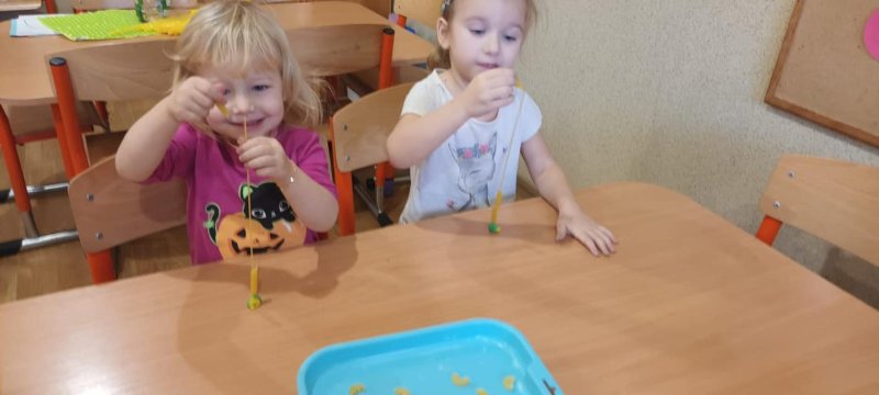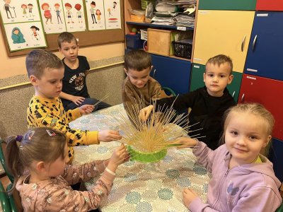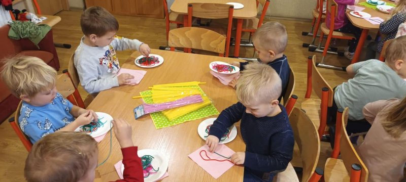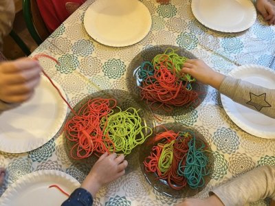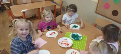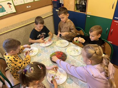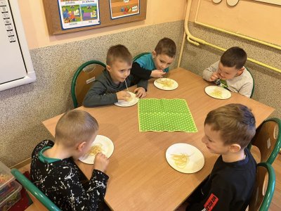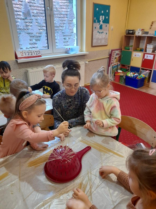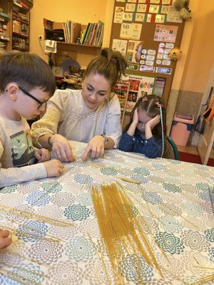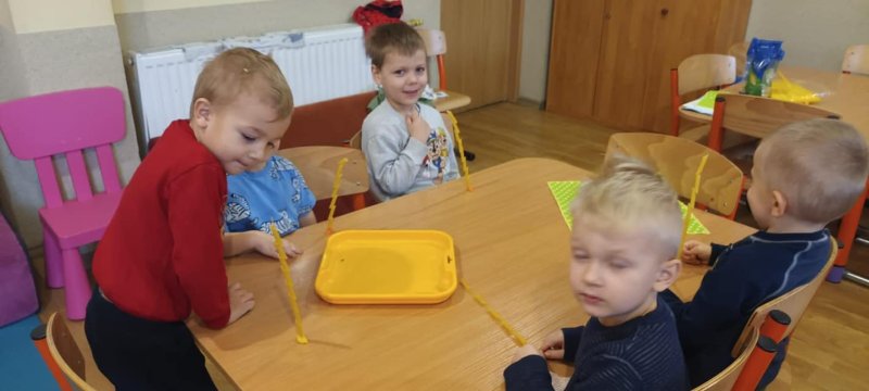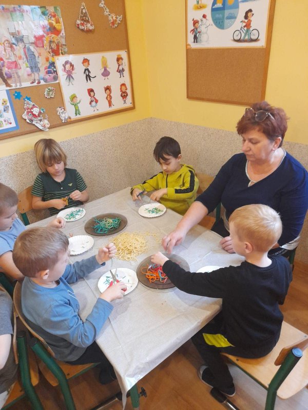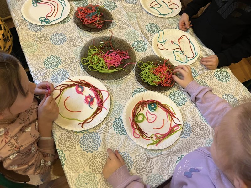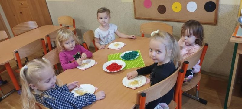 Dzień Spaghetti - Dzieci segregowały makaron kolorami, kształtowały koordynację oko - ręka podczas łowienia makaronu słomką. Rozwijały kreatywność i wyobraźnię tworząc własny talerz kolorowego makaronu, a potem kolorowy pejzaż i jeżyki. Dzień zakończony został pysznym spaghetti.