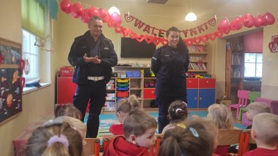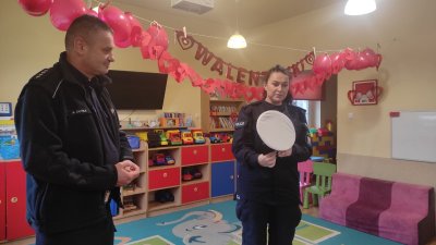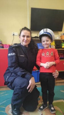 Wizyta policji w naszym przedszkolu. Młd.asp. Marta Qblin Kublin oraz asp.sztab. Arkadiusz Dutka WRD z KPP Nysa, przeprowadzili pogadankę na temat bezpiecznych ferii.