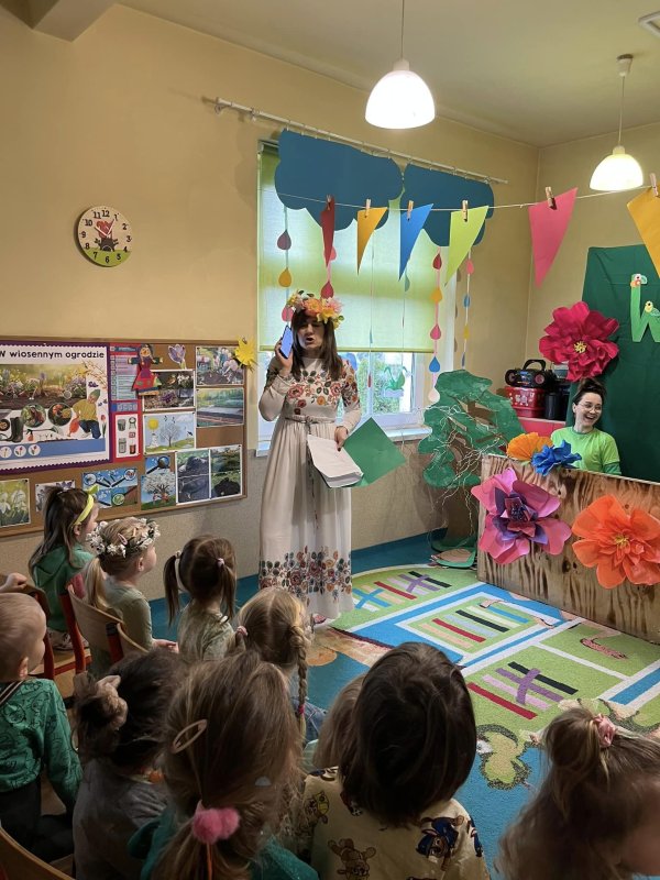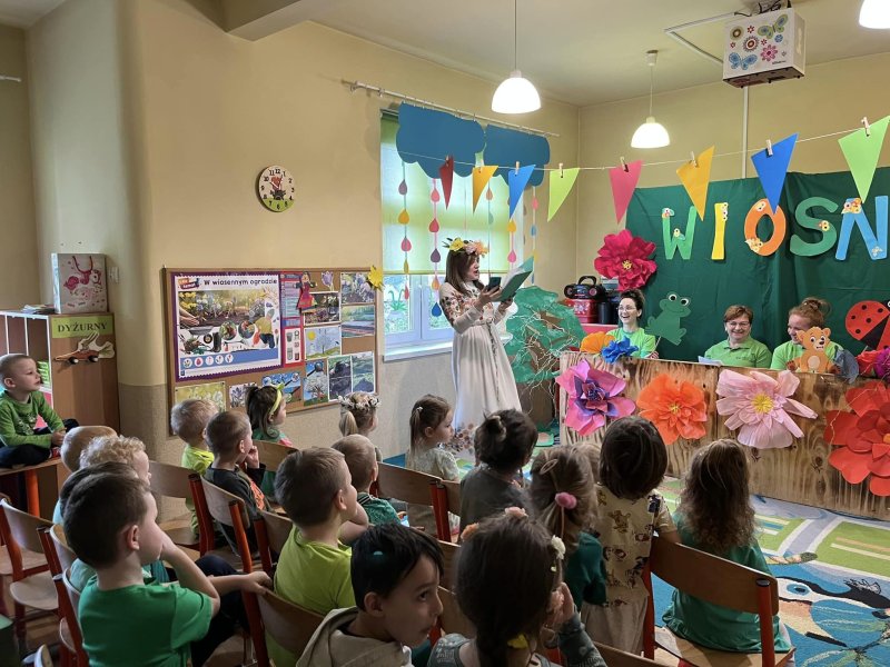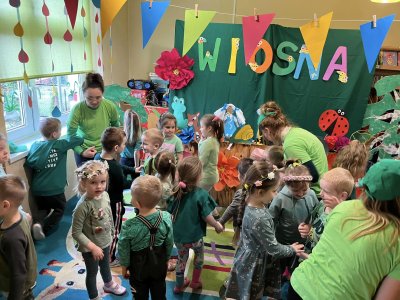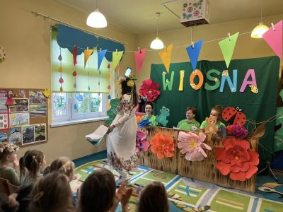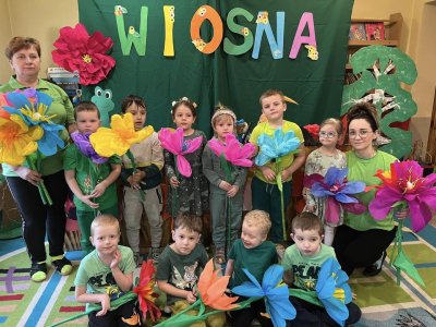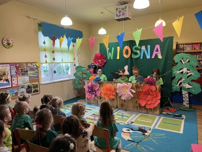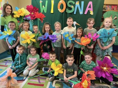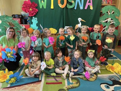 21 marca przedszkolaki obchodziły Pierwszy Dzień Wiosny. Dekorowaliśmy sale, malowaliśmy i wycinaliśmy wiosenne kwiaty, sadziliśmy cebulki kwiatowe. Obserwowaliśmy pogodę, śpiewaliśmy i tańczyliśmy przy skocznej muzyce. Panie nauczycielki przygotowały teatrzyk kukiełkowy ,,Wiosna”.