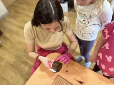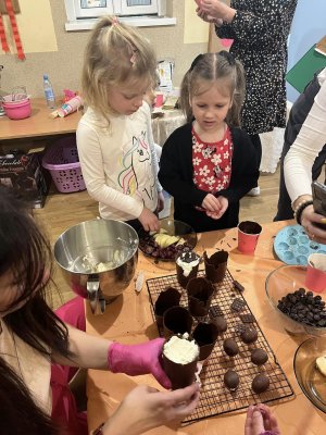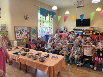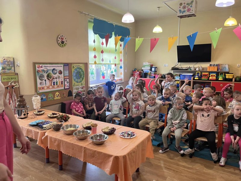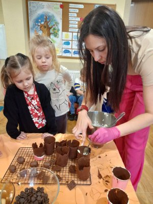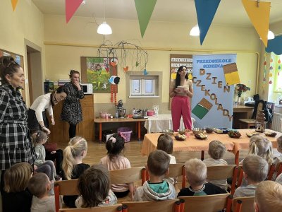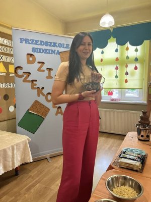 powąchać, dotknąć, a przede wszystkim spróbować czekoladę. Dzieci dowiedziały się z czego powstaje czekolada oraz co jest jej głównym składnikiem. Przedszkolaki poznały także jak wygląda proces tworzenia czekolady i gdzie jest stosowana. Pani Ola zaprosiła nas na magiczną ucztę czekoladową . Było pysznie . Dziękujemy