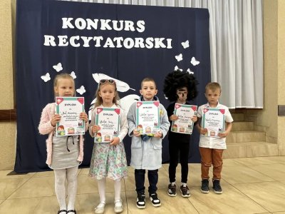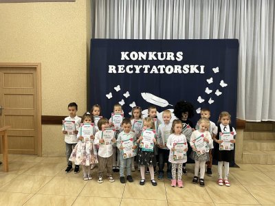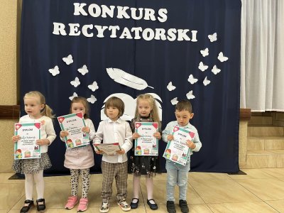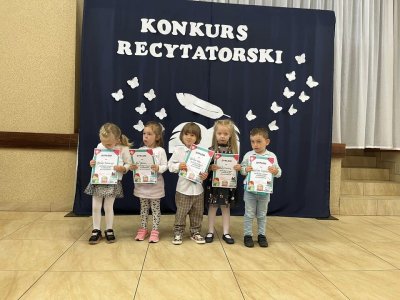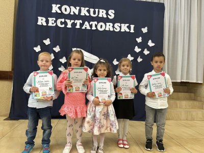 Dnia 24.05.2023r. nasze przedszkolaki wzięły udział w Konkursie Recytatorskim , przedstawiając poezję dziecięcą . Konkurs został zorganizowany przez Ośrodek Kultury Gminy Skoroszyce.