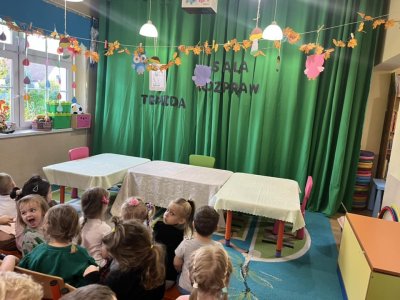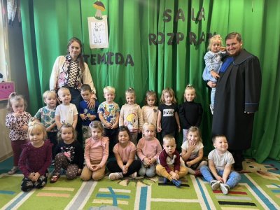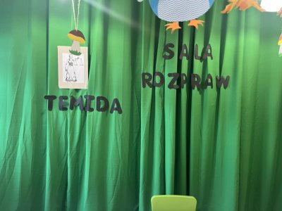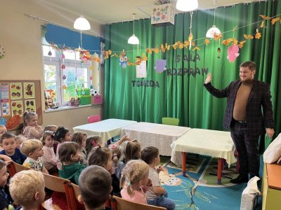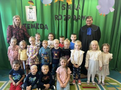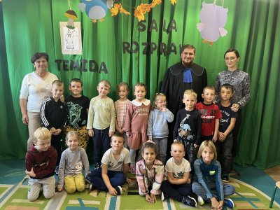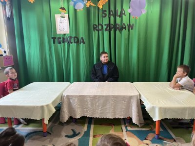 Pan Sebastian opowiedział przedszkolakom czym się zajmują pracownicy sądownictwa. Po czym wspólnymi siłami odegraliśmy “rozprawę sądową “. Dzieci wcieliły się w rolę obrońcy, oskarżyciela oraz świadka.