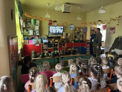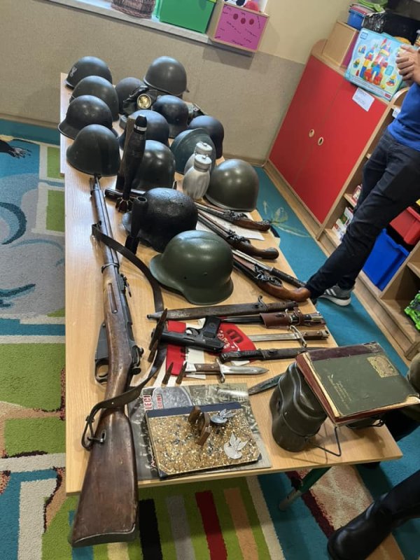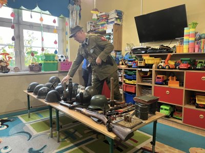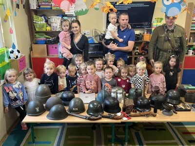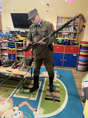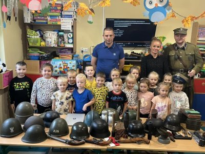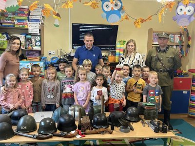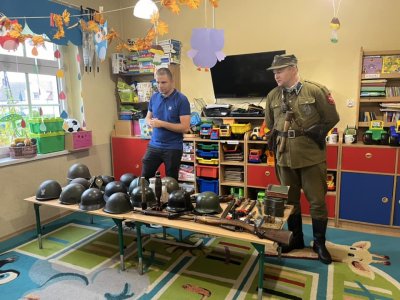 W cudowny sposób przybliżyli dzieciom historię odzyskania przez Polskę Niepodległości. Dzieci miały możliwość zapoznać się z akcesoriami wojennymi. Na koniec Panowie wyświetlili swój autorski film SOSW w Grodkowie, pt. „W hołdzie z serca żołnierzom wyklętym poległym w Starym Grodkowie”, który zajął I miejsce w XII Ogólnopolskim konkursie „Żołnierze wyklęci bohaterowie niezłomni”. Bardzo dziękujemy za wspaniałą lekcję historii.