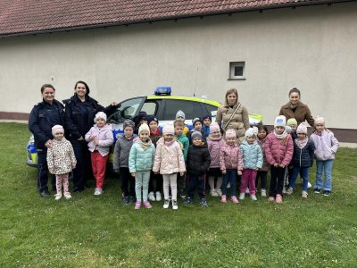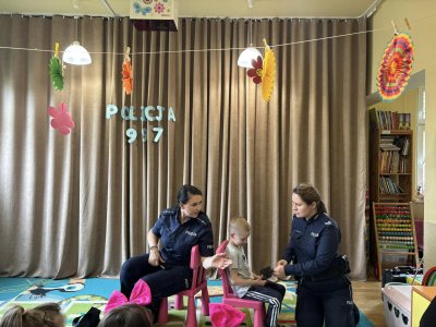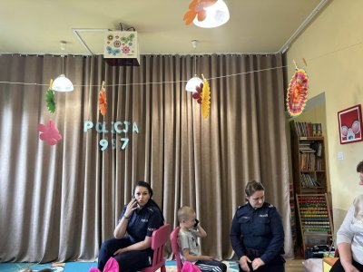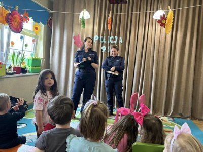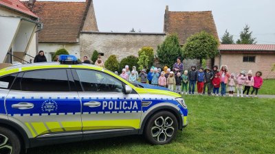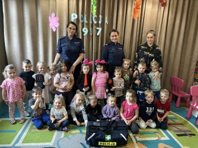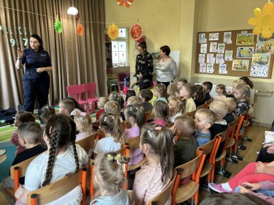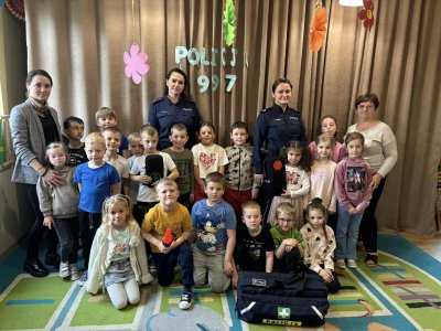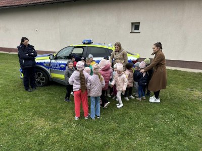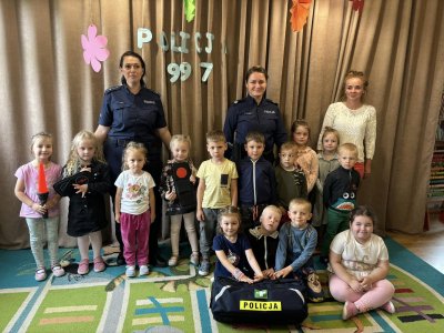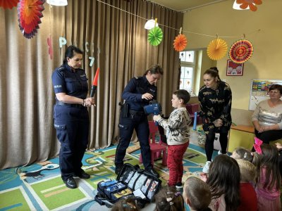 24 kwietnia nasze przedszkole odwiedziły panie policjantki z KPP Nysa, które przybliżyły dzieciom podstawowe zasady bezpiecznego poruszania się po drogach oraz przypomniały numery alarmowe. Dzieci otrzymały wskazówki, jak zachować się w sytuacji spotkania osoby obcej oraz ataku groźnego psa. Największym zainteresowaniem cieszyła się prezentacja radiowozu oraz prezentacja wyposażenia policyjnego niezbędnego podczas wykonywania pracy policjanta. Dzieci dzieliły się także swoimi doświadczeniami, pokazały, że są odpowiedzialne i wiedzą, jak należy się zachowywać na drodze i w najbliższym otoczeniu.