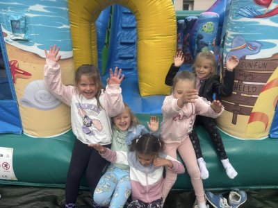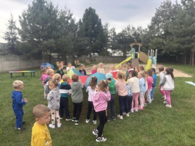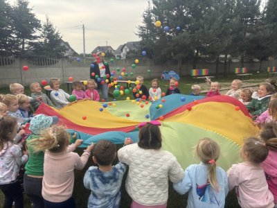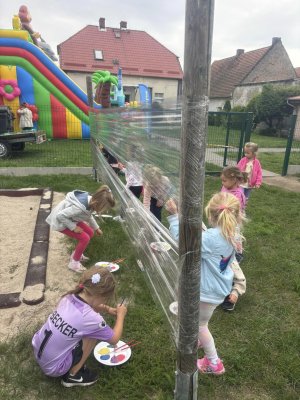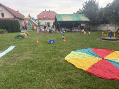 Dziaiaj z tej okazji nie zabrakło zabawy i czerpania radości z bycia przedszkolakiem. Odbyły się zawody sportowe na boisku przedszkolnym: przeciąganie liny, rzut piłeczką do kosza, slalom między krążkami, bieg z przeszkodami oraz zabawy z chustą animacyjną, malowanie na folii , a także zabaw na zamkach dmuchanych -Dmuchańcowe Love Sebastian Sikora