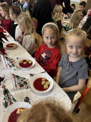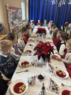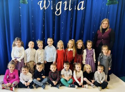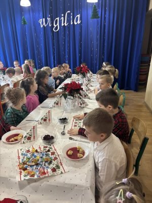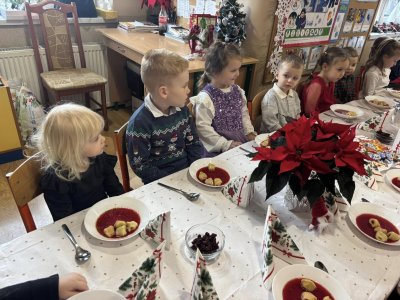 W dzień przedszkolnej wigilii panowała radosna, ożywiona atmosfera. Świąteczne dekoracje oraz dzieci w galowych strojach wprowadzały nastrój oczekiwania na wyjątkowe, niecodzienne wydarzenie. Uroczystość rozpoczęły wspólne życzenia i kolędowanie. Na stole pojawiła się tradycyjna ryba, a także inne świąteczne przysmaki. Jak zwykle było pysznie