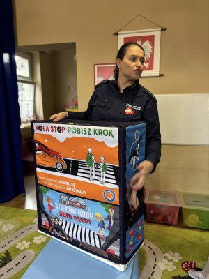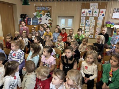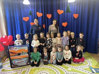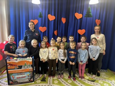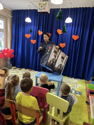 Marta Qblin mamą Milenki -naszego przedszkolaka- „Bezpieczeństwo podczas ferii zimowych”. Pani policjantka przypomniała o zagrożeniach czyhających na nich w trakcie ferii zimowych, powiedziała też jak ich unikać. Pani policjantka omówiła ze wszystkimi przedszkolakami zasady bezpieczeństwa podczas uprawiania sportów zimowych i zabaw na świeżym powietrzu. Przestrzegała również przed ślizganiem się na skutych lodem jeziorach, stawach i rzekach. Ostrzegła przed zjeżdżaniem z górek znajdujących się blisko ruchliwych ulic. Funkcjonariuszka udzielili wskazówek jak bezpiecznie bawić się na śniegu i jak zachować się na kuligu. Poinformowała dzieci pozostające w domu o konieczności zamykania drzwi od wewnątrz i o zakazie wpuszczania osób nieznajomych. Następnie wytłumaczyła jak należy zachować się w kontaktach z obcymi ludźmi, jak dbać o bezpieczeństwo własne i innych oraz do kogo zwracać się o pomoc w sytuacji zagrożenia. Dzieci z dużym zainteresowaniem słuchały rad i wskazówek zaproszonego gościa.