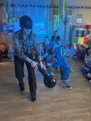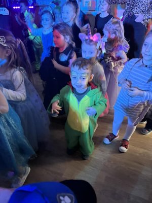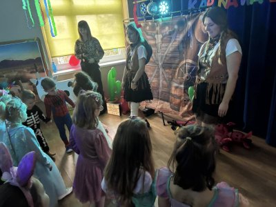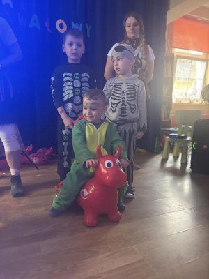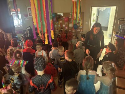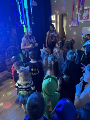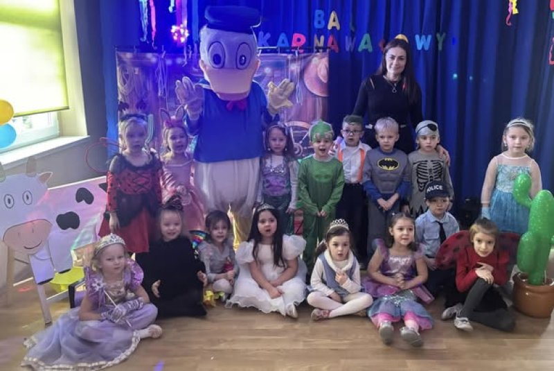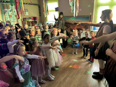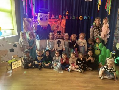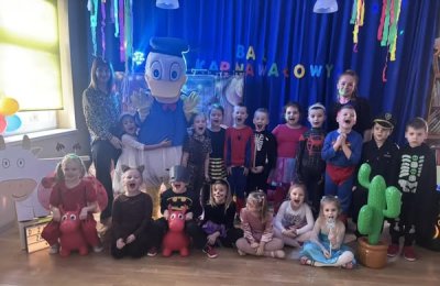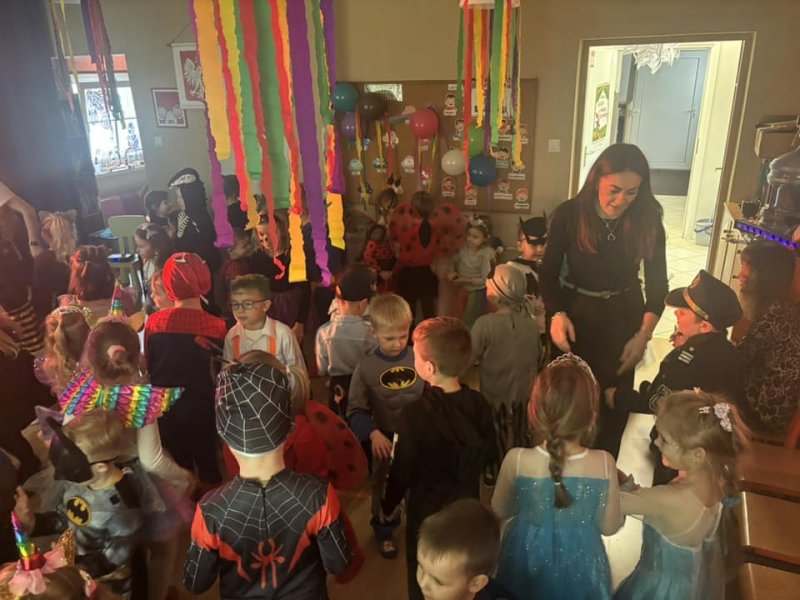 Bal karnawałowy dla przedszkolaków to dzień niezwykły, często wyczekiwany przez wiele tygodni. Jest atrakcją bardzo lubianą przez dzieci, dostarczającą im wielu przeżyć i radości. Tak też było w naszym przedszkolu w dniu 28.01.2025r. Tego dnia już od rana w przedszkolu pojawiały się kolorowe postacie. Dzieci przebrane były za bohaterów znanych bajek, w salach przedszkolnych można było spotkać wróżki, księżniczki, motylki, piratów, strażaków, policjantów, Spider-Mana, Batmana, nie sposób zliczyć i wymienić tych wszystkich postaci. Rozpoznać dzieci było bardzo trudno. Wystrój sali wprowadził w radosny nastrój oraz zachęcał wszystkich do wesołej zabawy. Wspólna zabawa przyniosła wiele radości naszym wychowankom, to było głównym celem tego balu. Przedszkolaki świetnie bawiły się w rytm muzyki porywającej do tańca oraz brały udział w najróżniejszych konkursach. Kiedy czas zabawy dobiegł końca dzieci z żalem opuszczały balową salę.